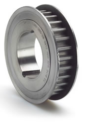 Trapezoidal timing belt tooth profiles include the pitches (distance from the center of one tooth to the center of the next tooth) MXL (.08″) , XL (.2″), L (.375″), H (.5″), XH (.875″), XXH (1.125″). LT (.0816″), T2.5 (2.5mm), T5 (5mm), T10 (10mm), AT5 (5mm), AT3 (3mm), and AT10 (10mm). Trapezoidal timing belt profiles excel at registration and are commonly available. L, H, XH, and XXH are readily available in neoprene with fiberglass reinforcements. T2.5, T5, T10, AT3, AT5, and AT10 belts are typically offered in urethane with steel reinforcements. MXL and XL belts are typically offered in neoprene with fiberglass reinforcements, urethane with kevlar reinforcements, or urethane with polyester reinforcements. LT pitch is typically offered in urethane with kevlar reinforcements or urethane with polyester reinforcements.